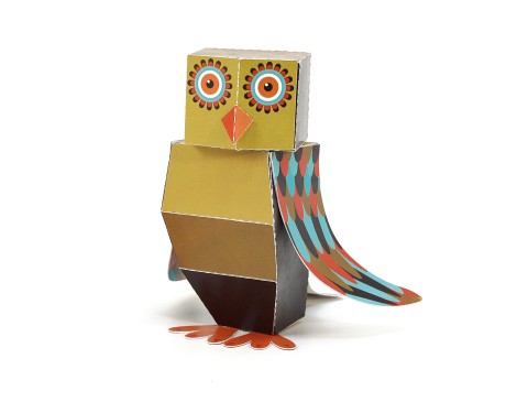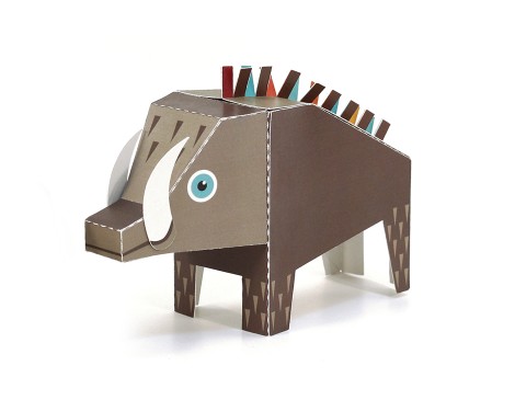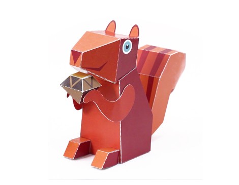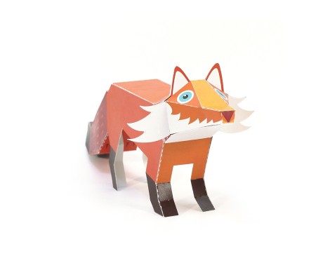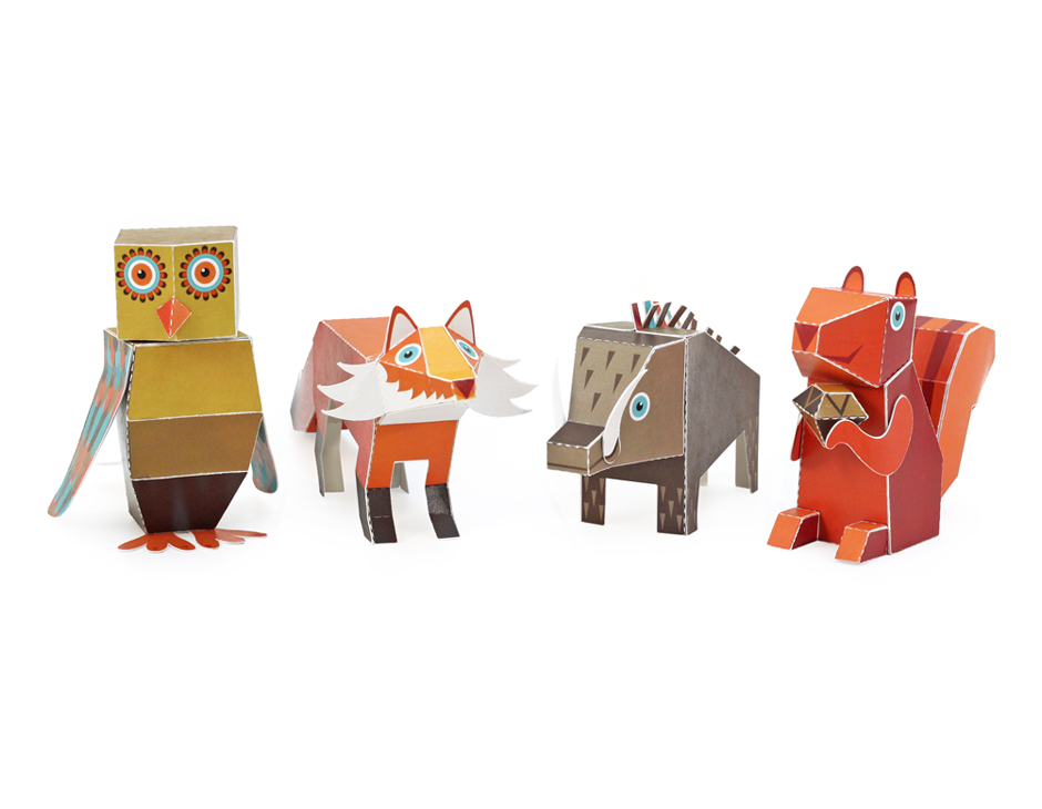 Tem quatro brinquedos de papel 3D - uma raposa, uma coruja, um javali e um esquilo.