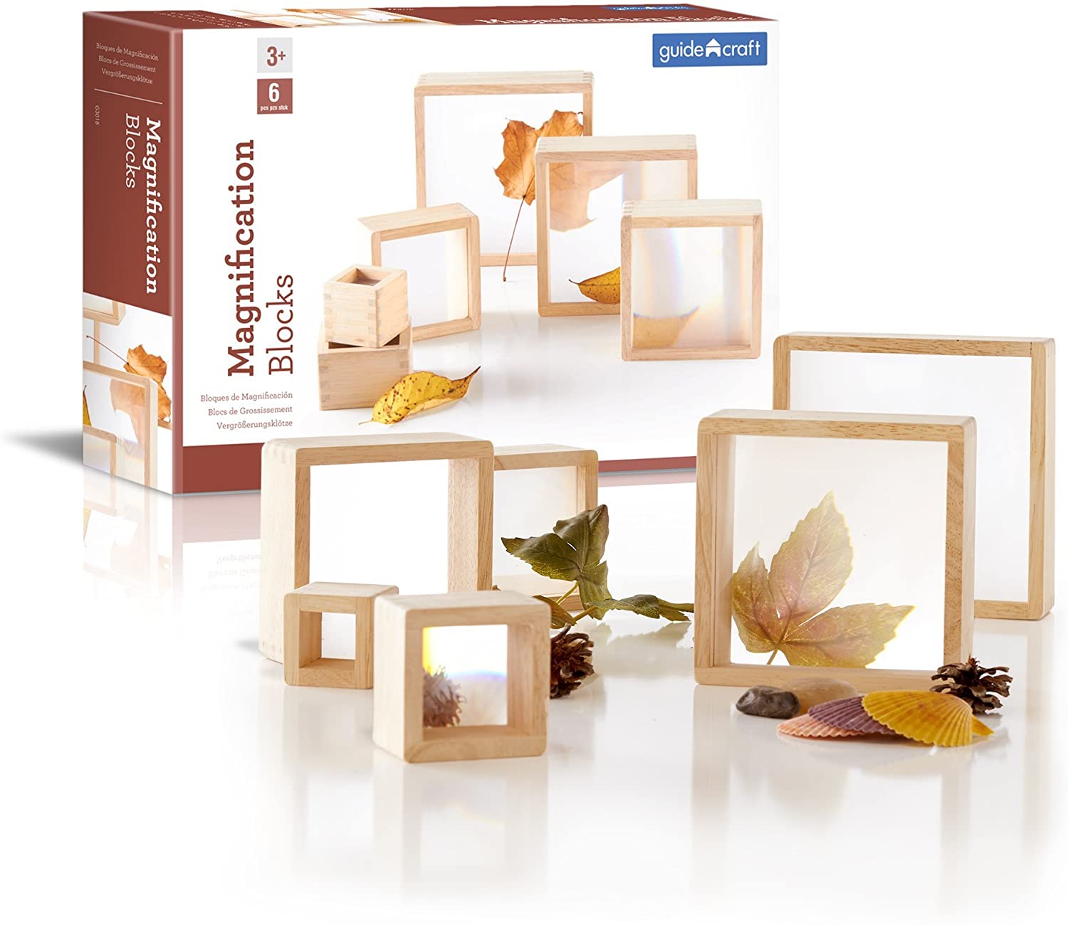 Seis quadrados empilháveis apresentam molduras de madeira e cantos e bordas arredondadas e suaves, com janelas de acrílico ampliadas. Ideal para explorar materiais naturais, táteis e outros materiais detalhados encontrados dentro ou na natureza.