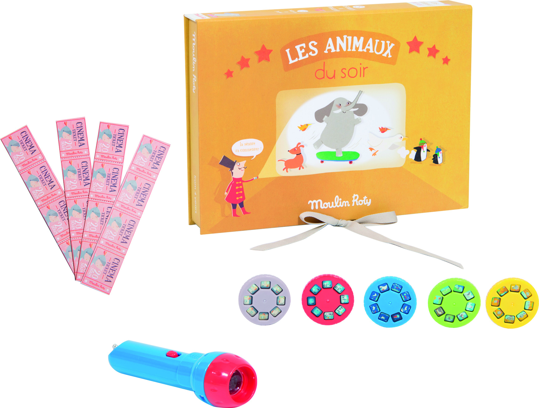 Apresentado em uma maleta resistente com uma gravata de fita, há tudo que seu filho precisa para montar seu próprio filme, incluindo ingressos e um bloco de notas para anunciar os horários de exibição. Ao ser aberta, a tampa da caixa forma uma tela de cinema e o filme é projetado com a ajuda da tocha de contos de fadas (bateria incluída). A tocha vem com 5 discos de história, cada um apresentando uma história de animal diferente.