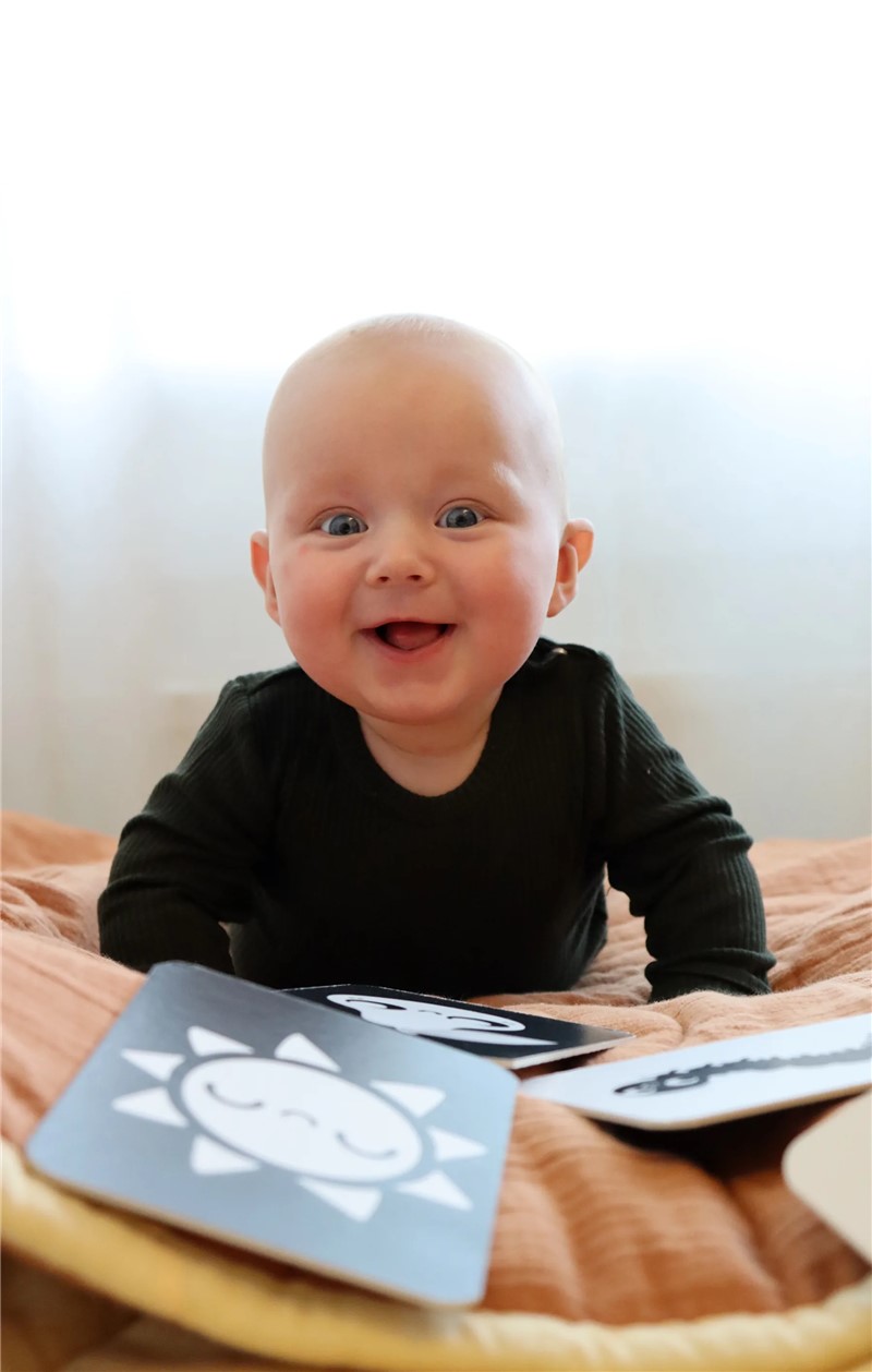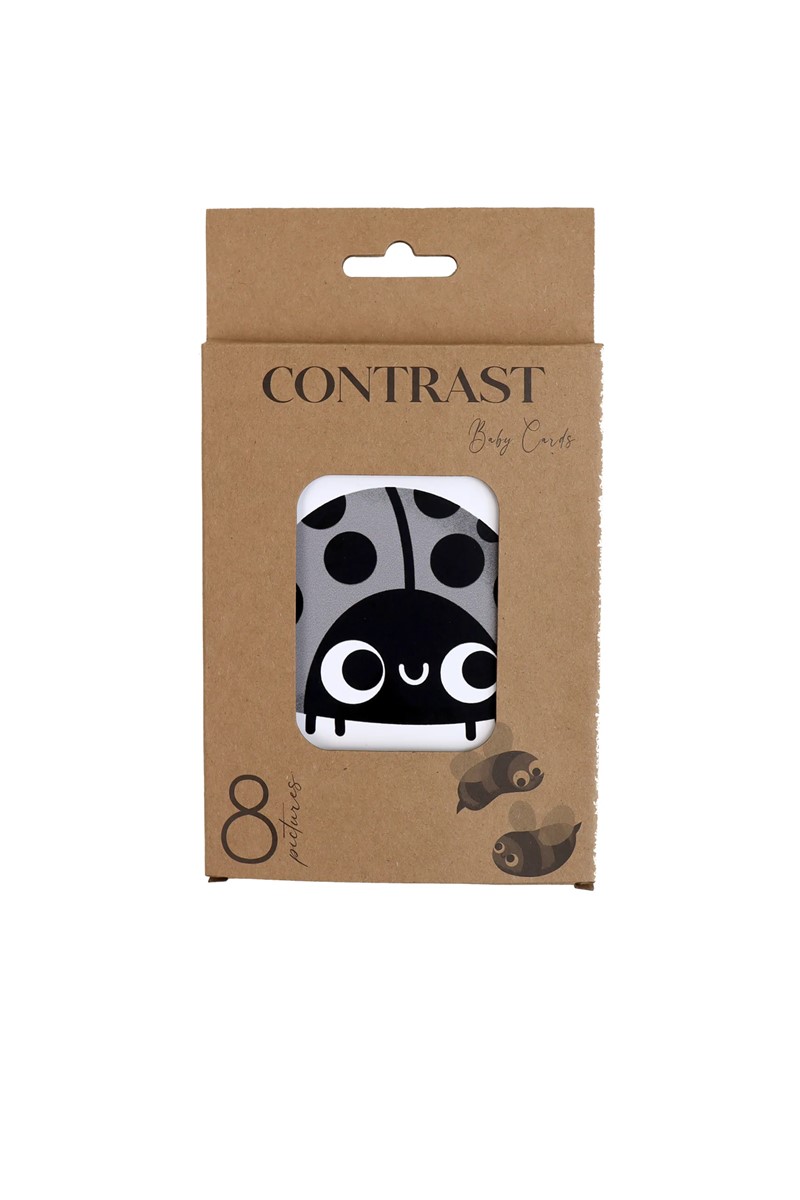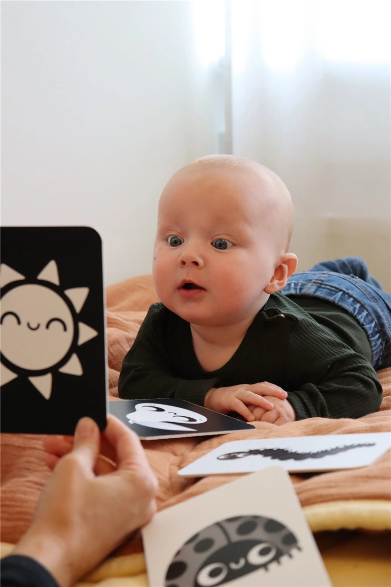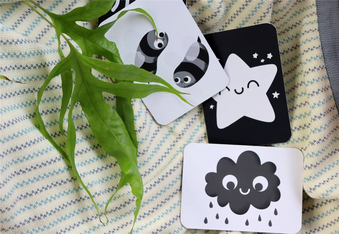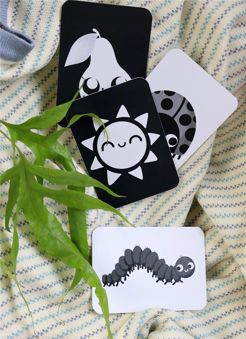 Cartões de aprendizagem visual para bebês, com oito lindas ilustrações monocromáticas de alto contraste.