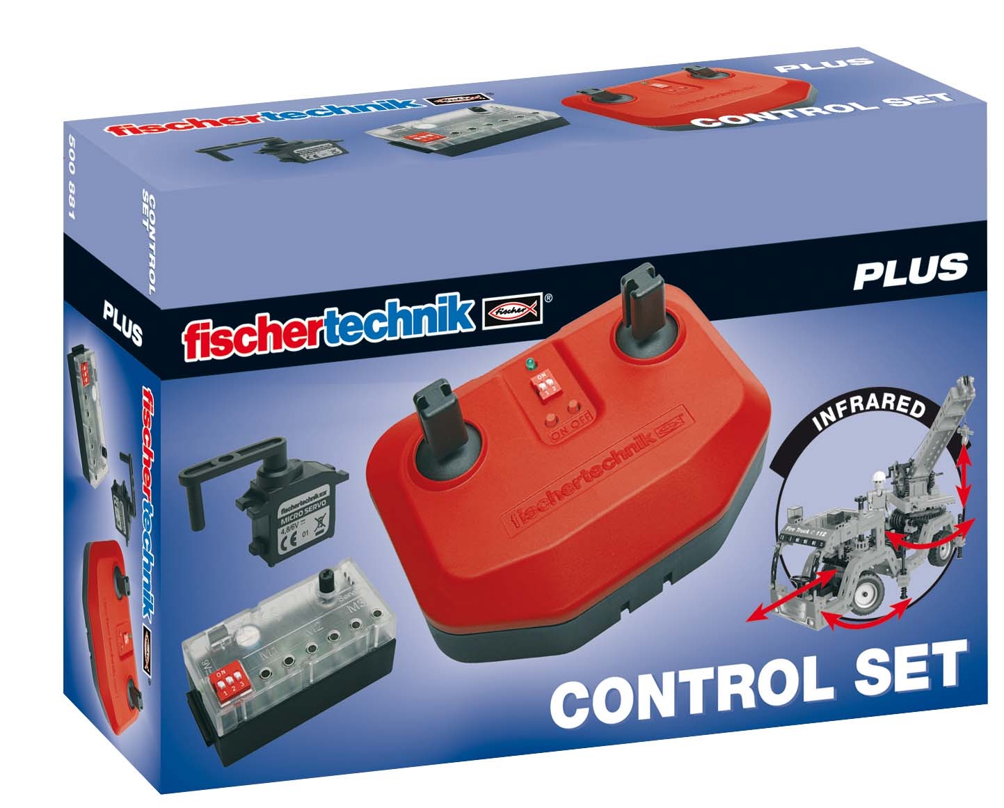Os quatro canais de controlo remoto infravermelho permitem controlar os modelos fischertechnik à distância. Mais de três motores podem ser acionados proporcionalmente. Isso significa um ângulo de viragem infinitamente variável do volante e controlo de velocidade infinitamente variável. Até quatro receptores podem ser operados com controlo remoto. O conjunto contém um controlador, um receptor e um servo. Requer fonte de alimentação (não incluído).