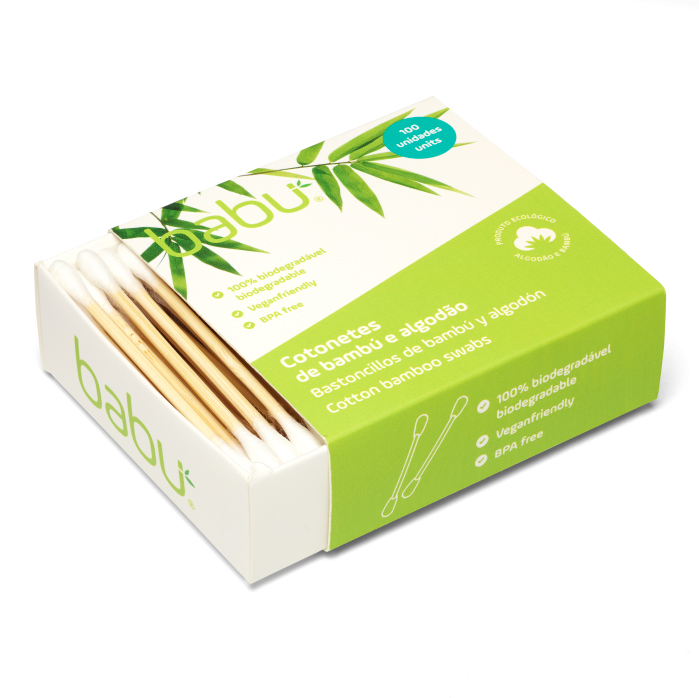 Embalagem inteiramente biodegradável, com 100 cotonetes em bambú e algodão