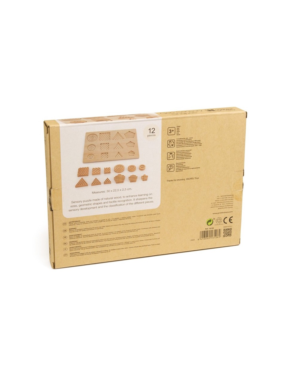Quebra-cabeça sensorial de 12 peças, feito de madeira natural.