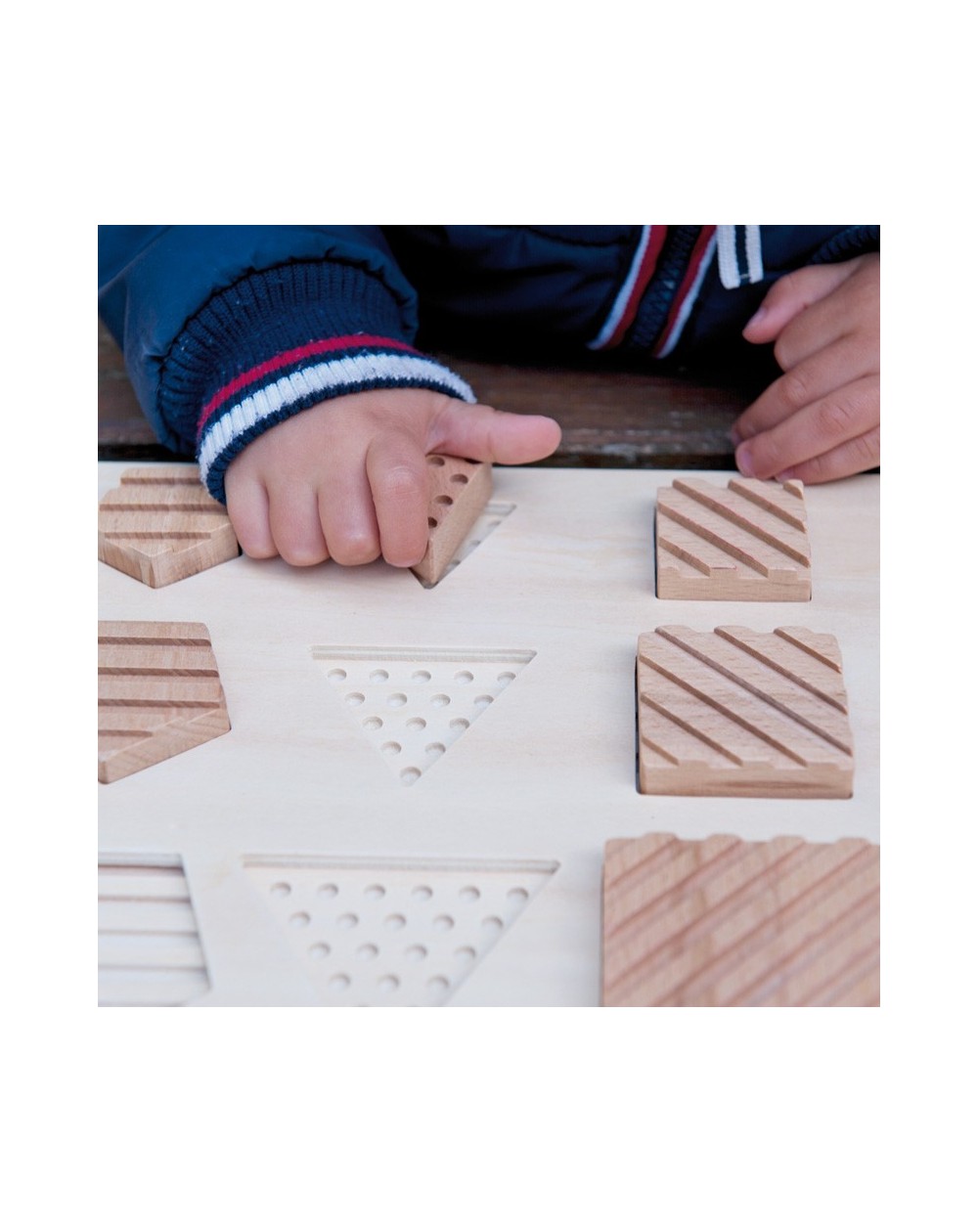 Aguça o desenvolvimento sensorial e a classificação das diferentes peças, segundo a sua dimensão, forma geométrica e/ou relevo.