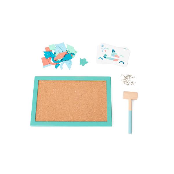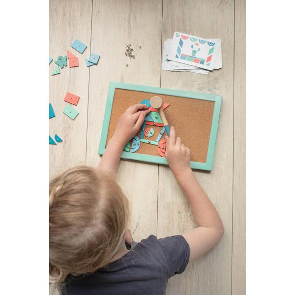 Bata, bata, bata! Bata sem parar com nosso jogo de cortiça e madeira para horas de diversão! Reproduza os desenhos das cartas ou crie suas próprias obras coloridas com todas as peças de madeira.