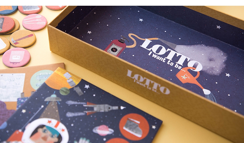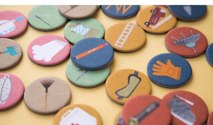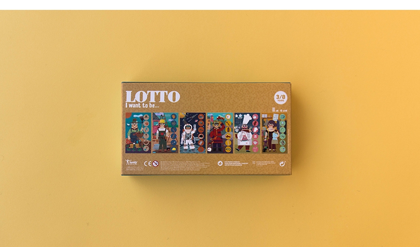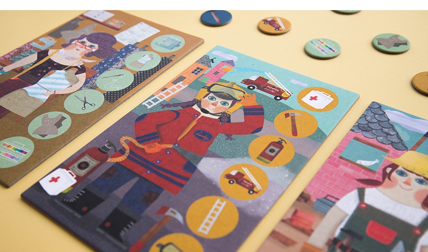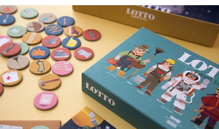 Um jogo de loteria para crianças e adultos; o vencedor é o jogador que coleta primeiro todas as imagens de sua ocupação.