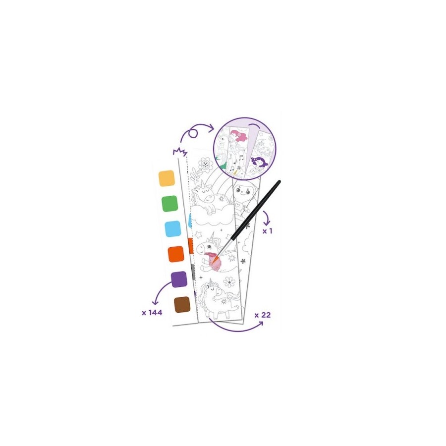 Cada página tem sua própria paleta de tinta, você só precisa de um pouco de água e pode liberar sua imaginação.