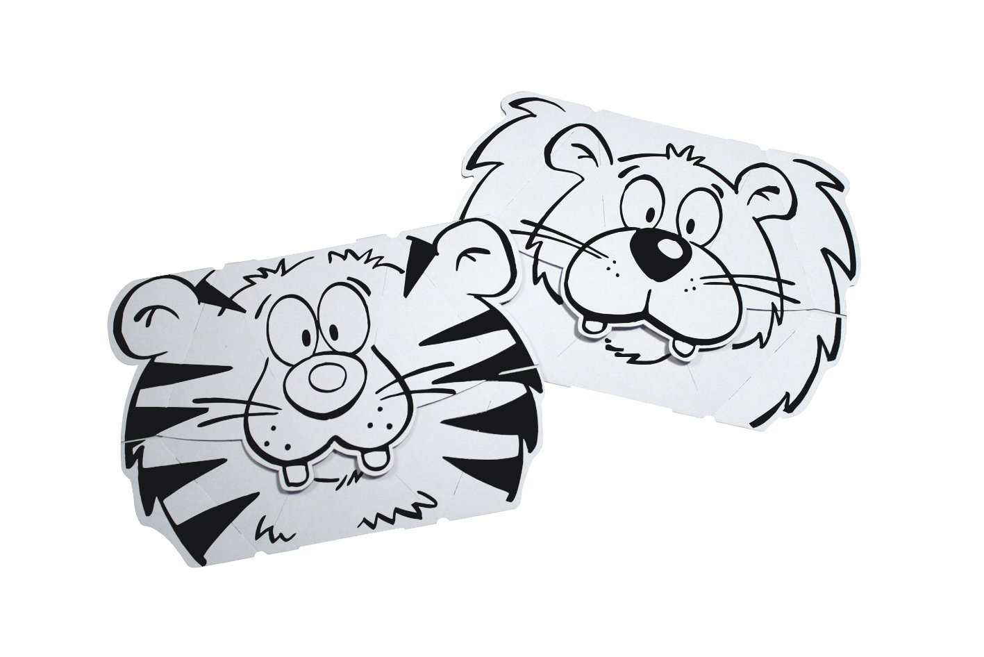 Não é necessário cola para as montar, e podem ser pintadas e decoradas ao gosto de cada um. As máscaras podem ser facilmente animadas com a ajuda das mãos! E depois rapidamente todas as criança se tornam a sua personagem!