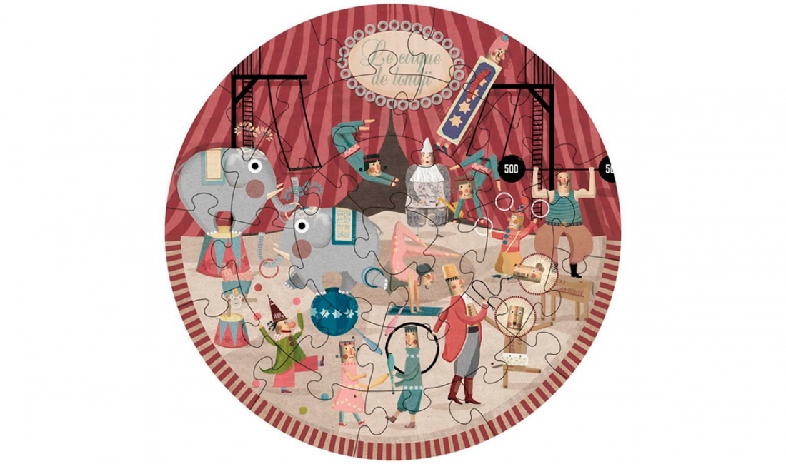 • Puzzle redondo temático de circo com embalagem mostrando elefantes e artistas circenses